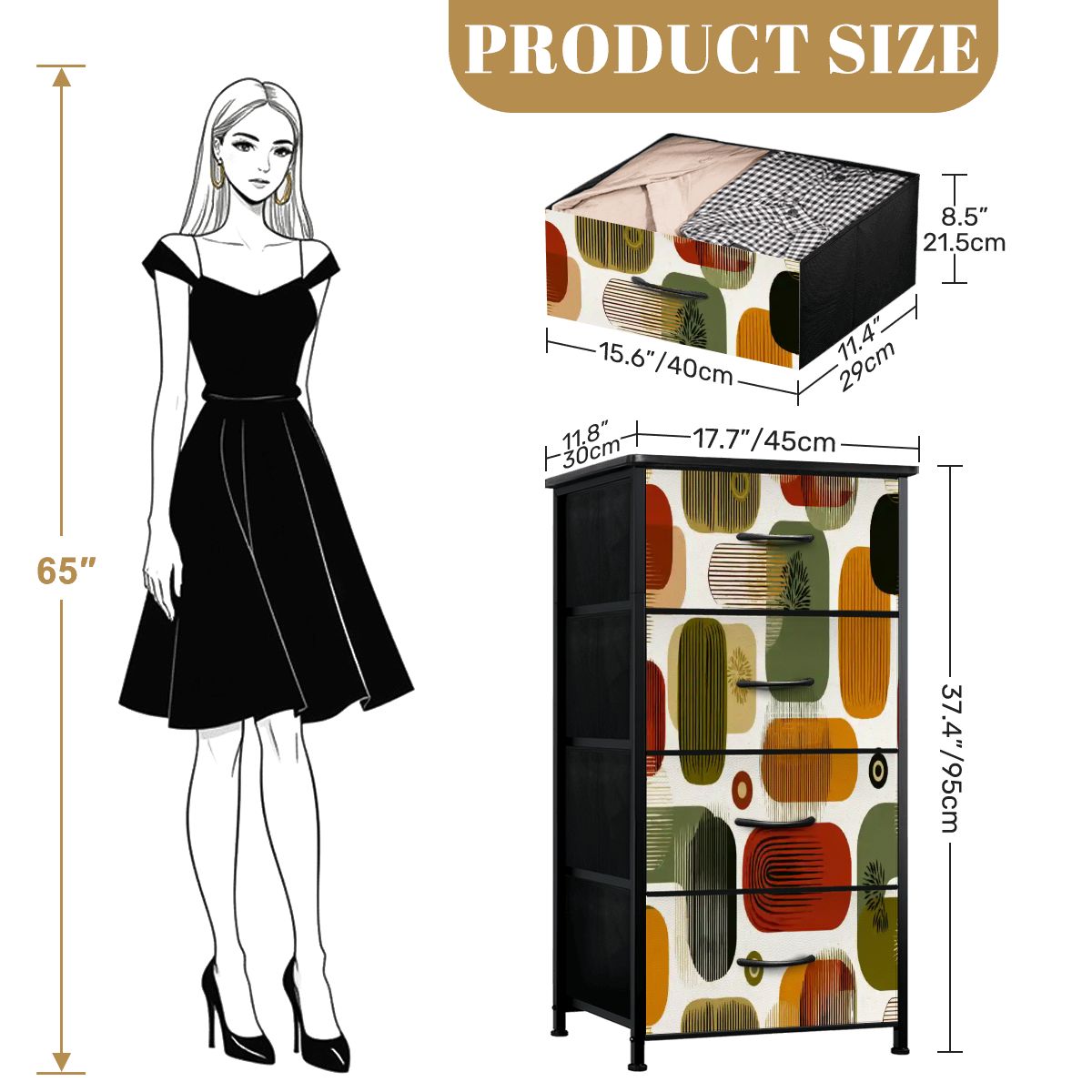 Add a touch of mid-century modern style to your home with this beautifully designed Geometric 4-Drawer Dresser. Featuring bold, retro-inspired shapes in earthy orange, olive, and mustard tones, this dresser blends functionality with modern design for a stylish storage solution.